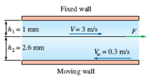 A thin 30-cm × 30-cm flat plate is pulled at 3 m/s horizontally through a 3.6-mm-thick oil layer sandwiched between two plates, one stationary and the other moving at a constant velocity of 0.3 m/s, as shown in Fig. P2–81. The dynamic viscosity of the oil is 0.027 Pa·s. Assuming the velocity in each oil layer to vary linearly, (a) plot the velocity profile and find the location where the oil velocity is zero and (b) determine the force that needs to be applied on the plate to maintain this motion.